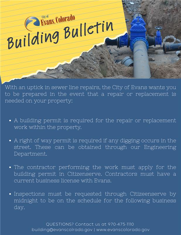 Each month, the City of Evans Building Division publishes a Building Bulletin, providing helpful tips, answers and more information on commonly asked questions and advice on all things building, renovating and remodeling related. To view the latest Building Bulletin, please click Building Bulletin January