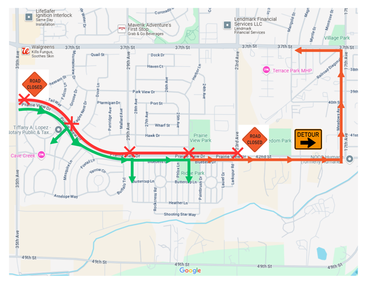 The westbound lanes of 42nd Street/Prairie View Drive will not be accessible from 23rd Avenue, 29th Avenue, Harbor Lane, or Eagles Nest Drive. Access to The Ridge at Prairie View neighborhood will only be available via eastbound 42nd Street at Harbor Lane and Blue Bells Drive. Cave Creek access will be available likewise only on eastbound 42nd Street/Prairie View Drive at Cedar Lane. Motorists exiting Cave Creek and The Ridge at Prairie View neighborhoods who want to travel west will need to detour east down 42nd Street/Prairie View Drive to 17th Avenue and travel north to 37th Street and then turn westbound. Access to and from Cave Creek will be available at 35th Avenue via Sagebrush Boulevard. Access to 42nd Street/Prairie View Drive from the east will be available at 17th Avenue and Carson Avenue.