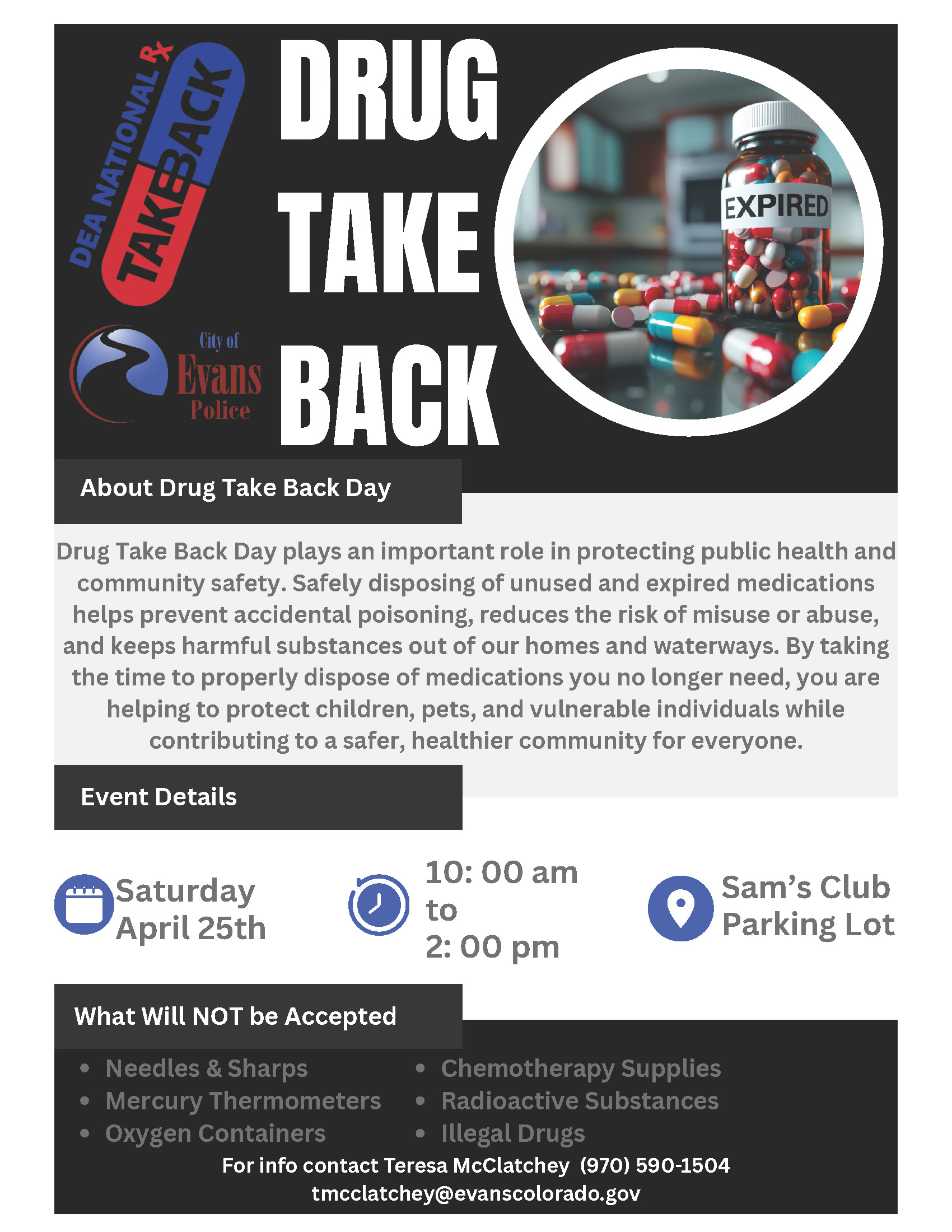 The City of Evans Police Department invites residents to participate in Drug Take Back Day on Saturday, April 25, from 10:00 a.m. to 2:00 p.m. at the Sam’s Club parking lot.