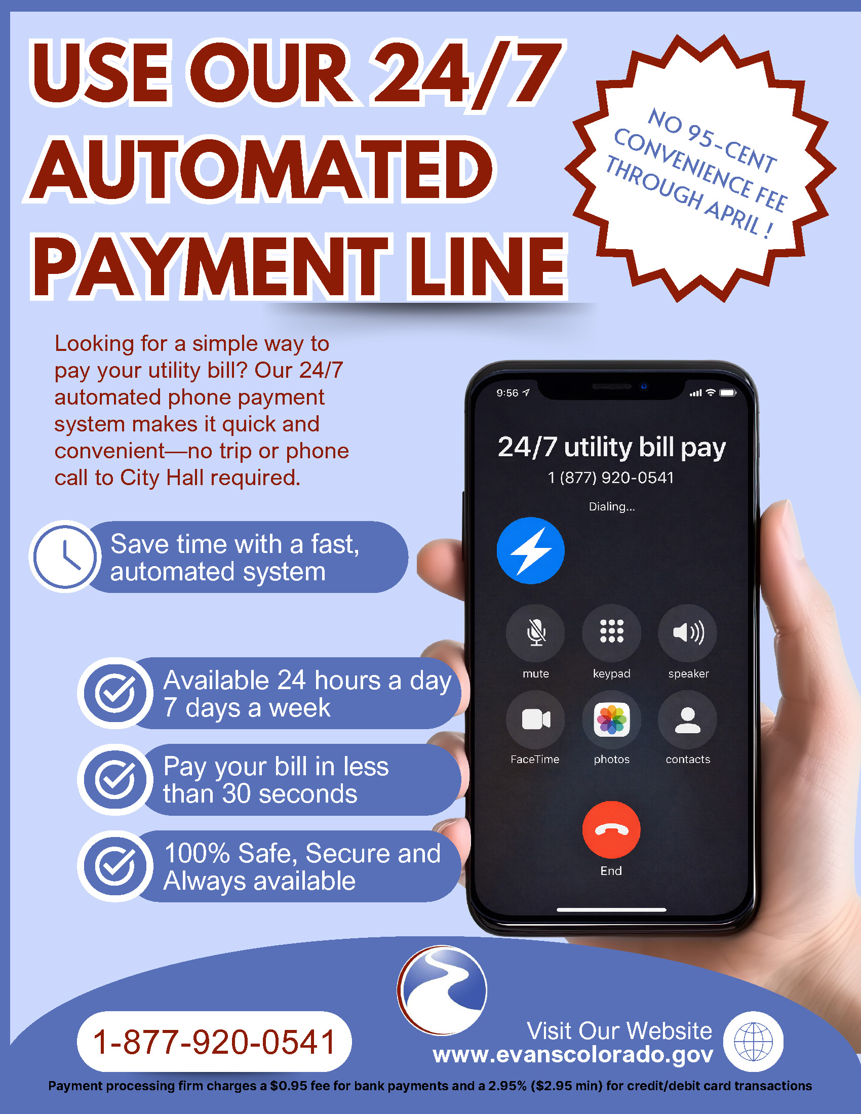 The City of Evans offers a convenient 24/7 automated phone payment system that makes paying your utility bill quick and hassle-free—no trip or call to City Hall required.